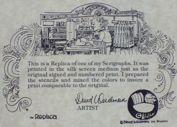 I’d been talking to David Weidman’s lovely daughter Lenna recently about purchasing