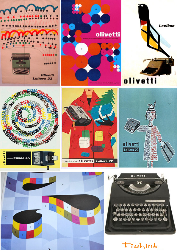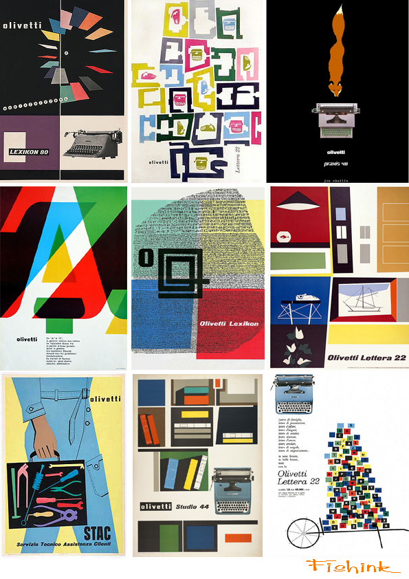 I am a big fan of the Olivetti posters. When I was in school I did an in depth report on Olivetti, which I didn’t know anything about beforehand. I was a little OCD about collecting images, but the posters were all so good, it was hard to just pick a few. An interesting thing to google – In 1955, Olivetti mounted one of their typewriters on a stand outside their New York Showroom on 5th Avenue and people lined up to try it out. A hidden camera was set up by Life photographer Michael Rougier and he took pictures of people typing short messages.