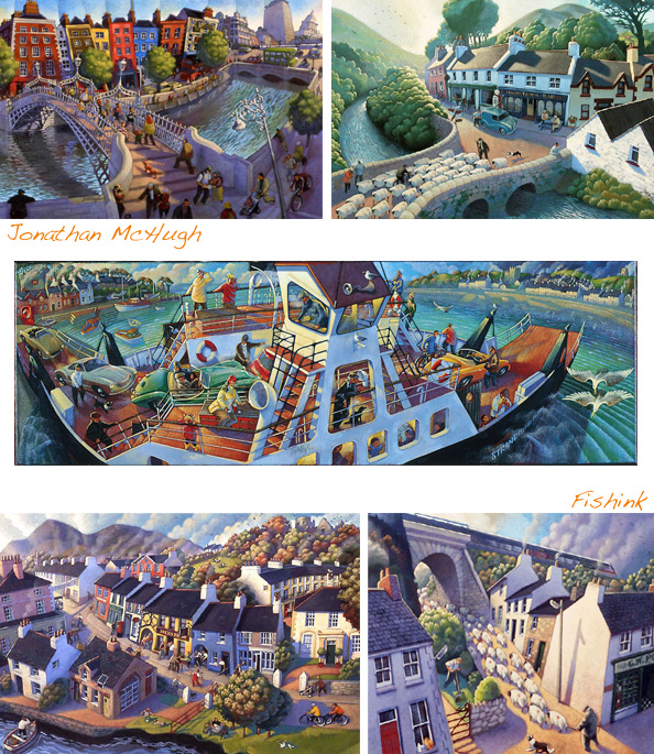 His work reminds me of the painting of the village at the start of Ballykissangel but I can’t find a link to