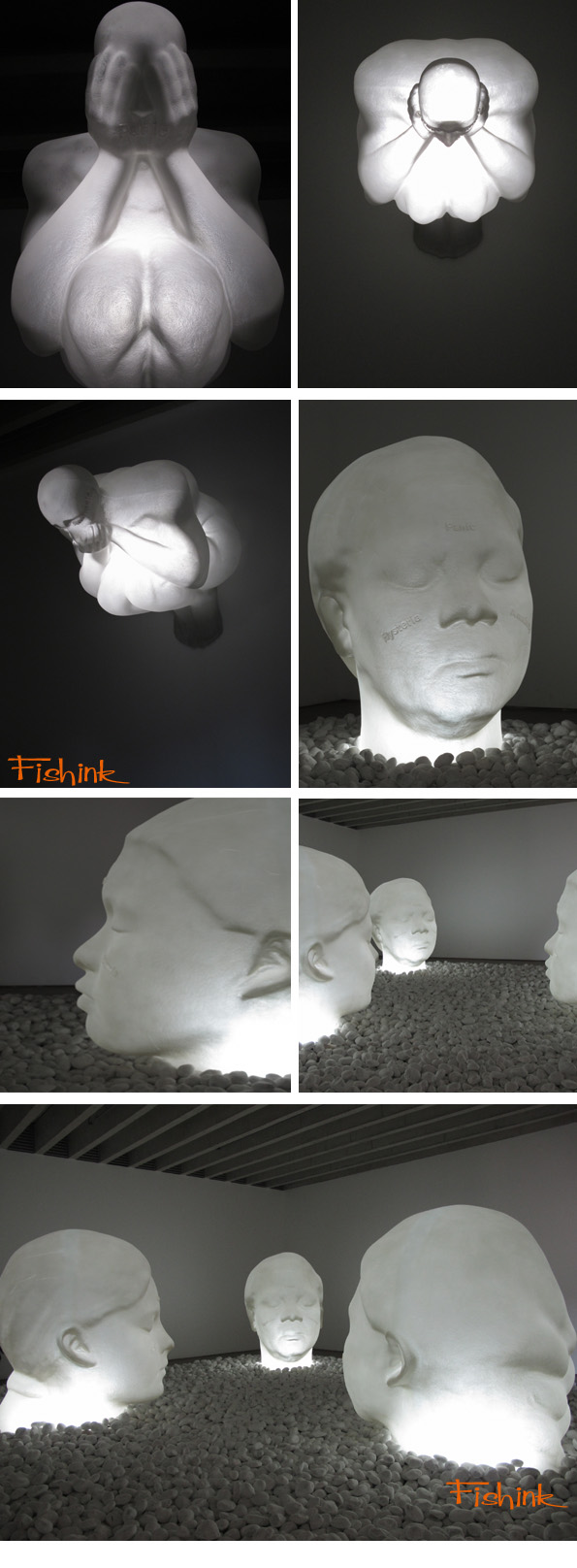 See no evil, hear no evil, speak no evil and then some huge heads with an eerie inner glow to them,