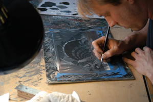 to name but a few. Here’s a glimpse of him at work in the studio, surrounded by his paint pots.