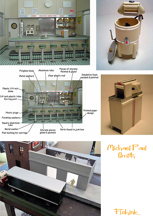 Would you be surprised to find out that the above places don’t exist anywhere that you can drive to, they have all been created by the very talented model builder Michael Paul Smith.  The places form an imaginary town from Michael’s memories of his growing up.  He has skilfully constructed them over hours and hours of patient labour and photographs the end results, often using real backgrounds in the distance that fit into the scale of his model street landscape.