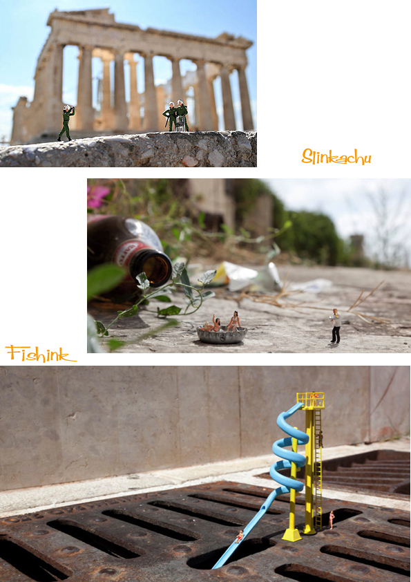 He quite often leaves the miniature sets where he photographs them and says that he returned to one about five days later and it was still there !  He says ” I started buying hard plastic train set figures and modifying them. I scrape away the details with a tiny knife, using a magnifying glass. I change them, too. One guy who was riding a bike, I turned him into a superhero about to fly off a building. I’ve used old zoo figures from the ’60s.”  Keep an eye out for something small coming to your neighbourhood soon !