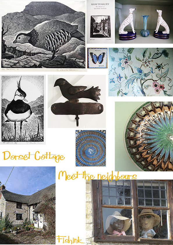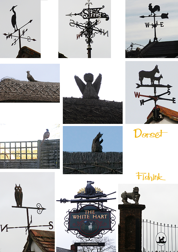 I also managed to gather a small collection of interesting weathervanes and thatched roof ornament on my Dorset travels. I guessed that the roof top animals were the thatch makers trade mark, but old country beliefs state that the stack and rick ornaments were created to keep away both birds and witches. The designs were originally of a religious nature, thus intended to scare away witches, but a countryman always hedges his bet, and would say the ornaments also gave a witch something to play with, thus diverting her attention from making mischief elsewhere.  One of the birds below is actually real, in case there are any blog reading witches out there !