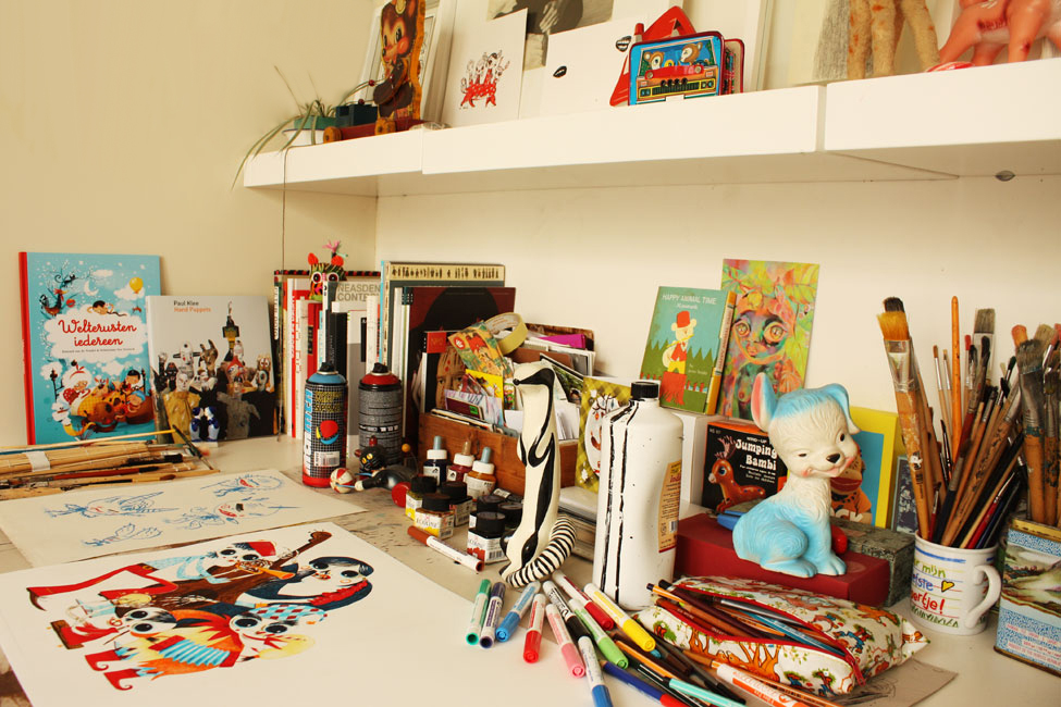 Sebastiaan says ” 75% of the time I work digitally, ie with the laptop and tablet. But sometimes I hate that rotcomputer and I work by hand and create everything with paper and ink. But the mood to work with the computer, always comes back. On holiday I can work manually. Then I take great sketch books and work on landscapes. I do this every year. Spontaneously, I work directly and quickly. Hand work is a trend with other illustrators. The drawings are warmer, you have more contact with the materials and it feels natural. I am also a fan of heavy ink paint. Stains and marks I scan in colour, puzzle them together on the computer and so I often arrive with a collage, with minimal edits in Photoshop. ” (taken from Coffee Klatch)