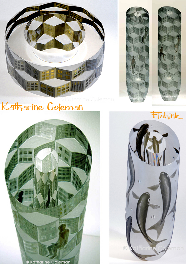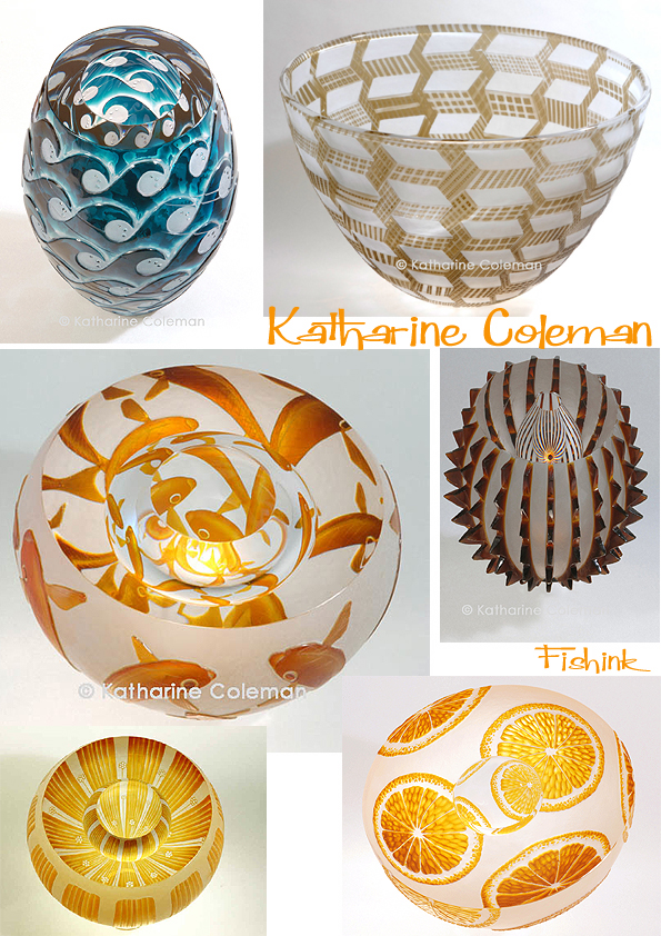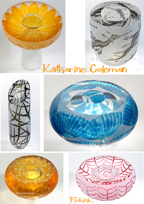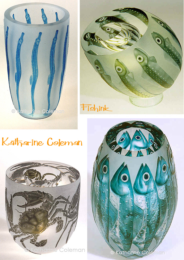 Katharine says ” I use traditional techniques, engraving the glass surface with lathe-mounted copper, diamond and stone wheels, preferring the crispness, textures and fine finish associated with these techniques. The inspiration for my work ranges widely from natural history to the modern urban landscape.” There’s obviously a real love of fish imagery in her work.