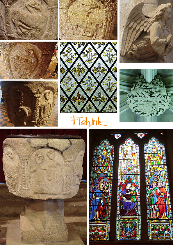 A superb font and some beautiful stained glass windows inside too.