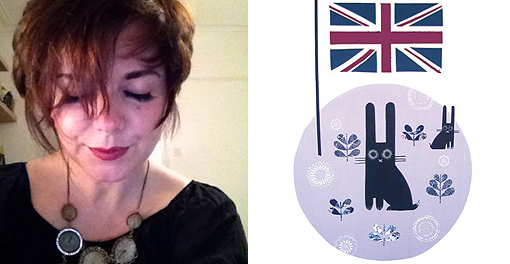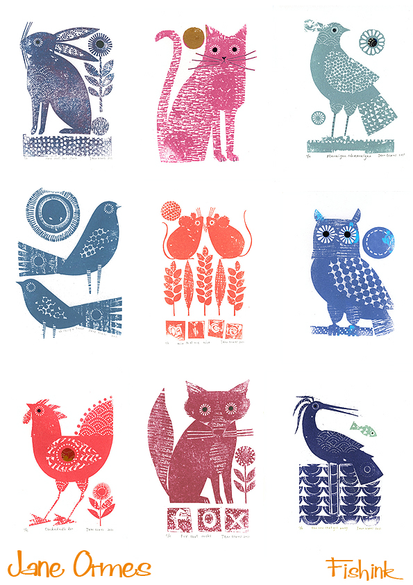 Jane says ” My screen prints reflect my take on the world.  I produce playful, colourful images, often involving animals in absurd situations. I like to think that these creatures all have a secret life that we know nothing about. I keep a notebook to jot down unsual names or lyrical phrases as these can often lead to an idea but its more likely that I will be inspired by a story or situation that tickles me.  Drawing, patterns & textures are all integral to my work as well as large areas of flat bold colour which can be achieved by the screen printing process. ”  She also likes the Japanese Gocco style of printing for it’s immediacy and portability too.
