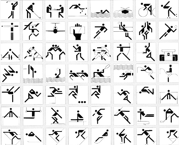 I’m not a sporty bod, but I thought I should do my bit for the Olympics. As an artist I thought I’d look at the range of posters and imagery that has gone before. Here’s a few from Otl Aicher, also known as Otto. He paved the way for the series of stick figures that have nowadays become well known on signs, architectural plans and even toilet doors !
