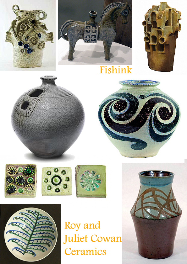 She met her future husband Roy Cowan when he, too, was working on school publications. Not long after they married in 1952, he won a two-year travelling scholarship and they went to London where he studied at the Slade School and she studied lithography and pottery part time at the Hammersmith School of Building and Crafts. They travelled – in a cheap old London taxi they bought – spent time in the Victoria and Albert Museum and were both influenced by Ken Clark, a New Zealander potting in London. Here are some of her London pieces.