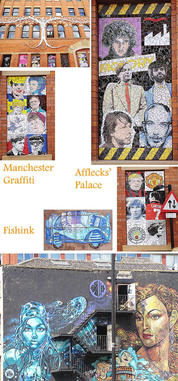 Afflecks’ Palace or more recently just Afflecks has some lovely work on the side of its building and some celebrity and celebratory mosaics of a Mancunian flavour. Coronation Street characters, Factory Records and Manchester United are all captured on its walls.