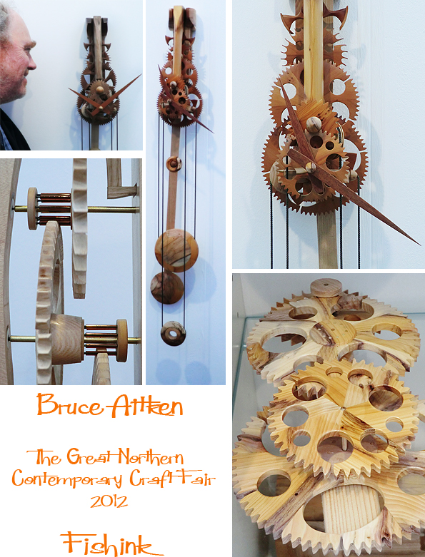 More from the wonderful Great Northern Contemporary Craft Fair 2012 that took place thursday to Sunday last week in Manchester. To start us off here’s some stylish woodwork from clock maker Bruce Aitken. I was drawn to the natural woods he used like cherry, ash, yew and walnut. These weight-driven pendulum clocks require winding daily, but hardly a price to pay for their gentle ticking away of the day, and bearing in mind each one takes about 90 hours of labour to create, they are more a work of art than just a groovy grandfather clock !