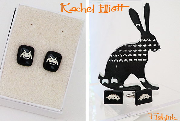 Once cut, the pieces are then hand screen-printed and finally fired in a kiln to make them water and light resistant. Rachel was showing a brand new range of cufflinks with that well known 70’s icon, the space invader. There’s a great interview with Rachel on UK Handmade here.