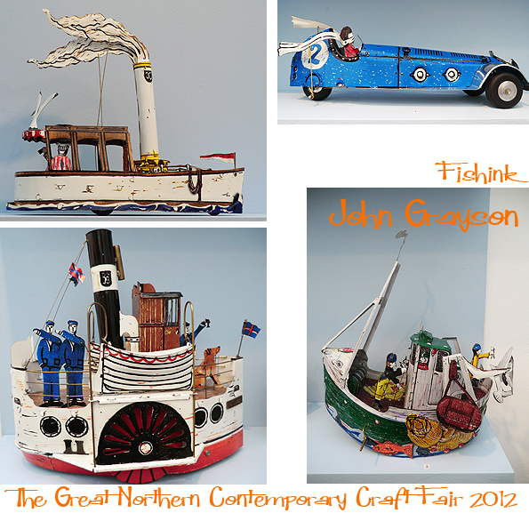 I couldn’t fail to include these charming vintage inspired tin toys by John Grayson. John describes himself as a narrative metal smith who uses traditional metal forming and decorating processes to create whimsical, humorous and decorative objects. The Steam Launch, Racing Car, Paddle Steamer and Fishing Boat pictured below range from £125 to £985. I was amused when he pushed them along to reveal their moving parts. Great to see these vintage references.