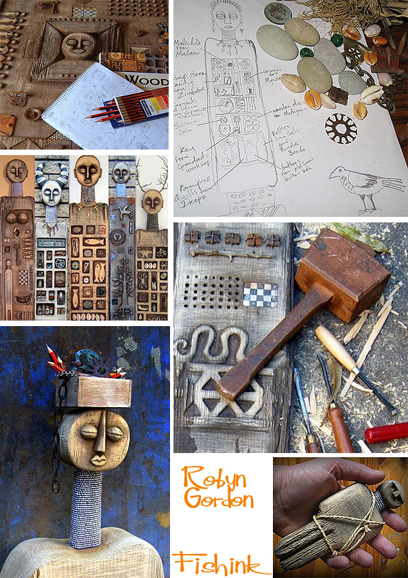 Robyn says ‘I am an artist living in KwaZulu Natal, South Africa. As a child on the farm I loved the outdoors. I loved to touch and feel nature in my hands. The smoothness of acorns and pebbles, the roughness of pine bark, the hollowness of birds nests …. anything tactile under my fingertips. At a young age I commandeered my mom’s unused carving chisels and I found that I could create many tactile qualities in the wood by chipping, gouging, whittling and sanding. This was a thrilling discovery! Now I carve wooden totems and panels, incorporating wire, beads and found objects. Through my work I tell the story of my life in South Africa. The niche carvings hold objects that are of the land, symbols of Africa and symbols of my British ancestry. The totems “speak” of legends that have been passed down from one generation to the next. They are meditative pieces which bring me a great sense of peace. It is an added joy when other people feel this quality in my work.’