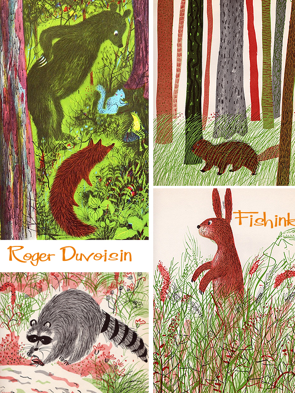 I enjoy with illustrations by Roger Duvoisin. I love how he presents the works of illustrators.