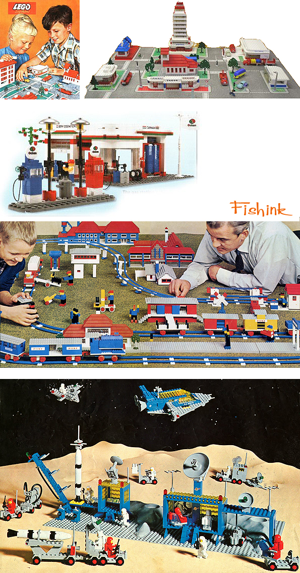 The first Lego wheel featured in Lego set no. 400 (above), which was released in 1962. In 1967 it was Lego’s best-selling set with an impressive 820,400 units sold. Since the 1960s, the Lego Group has released thousands of sets with a variety of themes, including town and city, space, robots, pirates, trains, Vikings, castle, dinosaurs, undersea exploration, and wild west. By the 1970s Lego was sold in Europe, North and South America and Japan: pretty much any market where people had money to spend on toys. The beautiful 1973 box and logo redesign, clearly Swiss influenced, was the first attempt at a true international standard and in 1978, Lego produced the first minifigures, which have since become a staple in most sets.