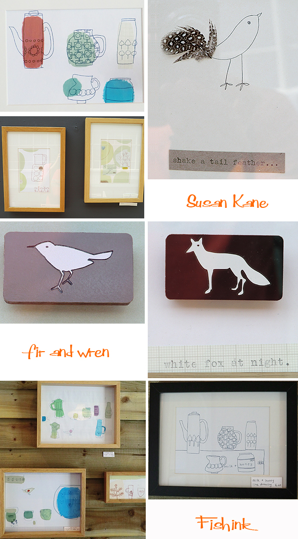 The next stop was to see Susan Kane and her lovely hand drawn illustrations Calico Angel at Holm which will soon be known as Fir and Wren. Susan trained in Manchester as a Textile Designer and after a period of selling designs to companies in the UK, Japan and Europe she has diversified into delicate linear illustration prints and broaches.