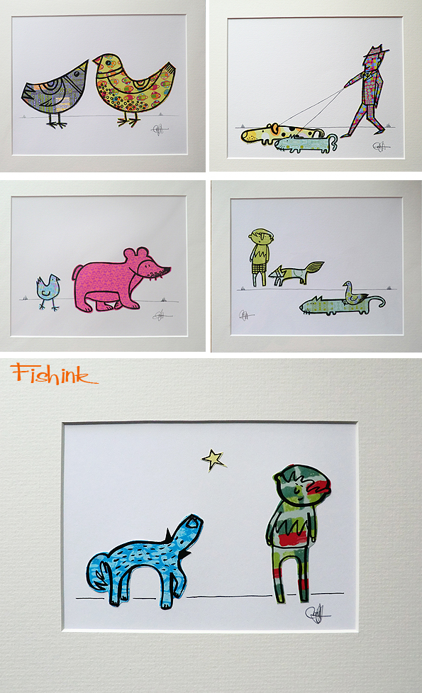 Prices start at just £30 for a 10 x 8 inch frame and go up to £40 for the 12 x 10 inch frame (plus p&p in both cases). Payment can safely and easily be arranged through paypal and sent anywhere in the world. I’m looking for comfortable new homes for my little characters or perhaps you have a friend who’s birthday is coming up, who may love an original hand collaged Fishink print on their wall ?  Commissions start at just £50.