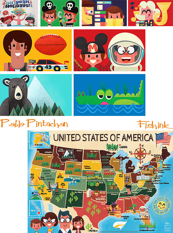 He describes his work as ‘ Retro, naïve and childish ‘ and is a confessed liquorice lover, enthusiast of old sci-fi movies and collector of children’s illustration books. His list of tools consist of a pencil, a box of Manley crayons, an iMac, a Wacom Cintyc and, especially, lots of books to learn from.