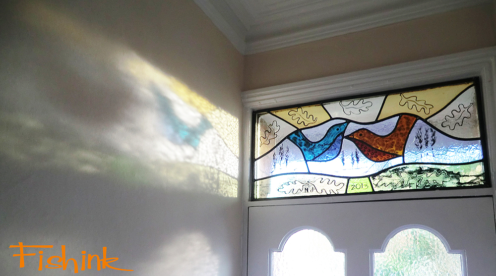 This new visitor is watching the colours of the stained glass panel I made which sits at the other end of the hall.