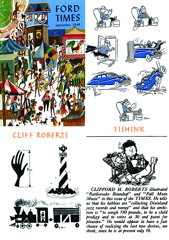 Thanks to Eric Sturdevant over at Fun All Around Blogspot for posting these illustrations which were some early work done by Cliff Roberts for FORD TIMES magazine in the late forties. He was in his late teens when he drew these ! Roberts cites illustrator Jan Balet as an influence of his from this period.