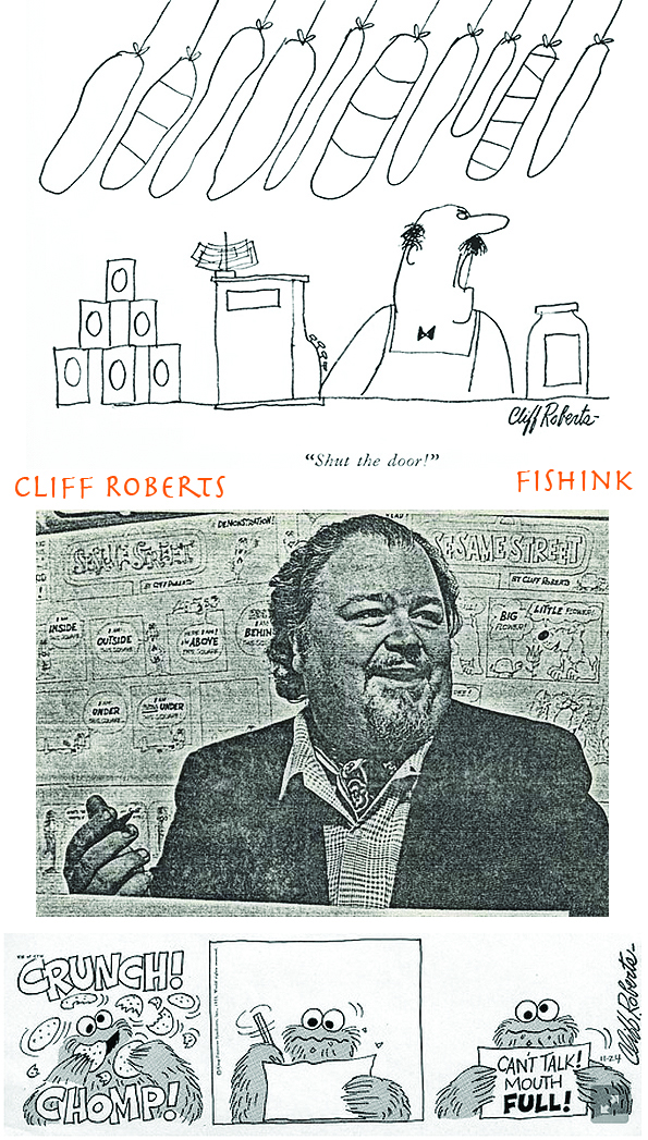Cliff Roberts (1929-1999) was a cartoonist and animator. His cartoons appeared in magazines such as The New Yorker and Playboy. He worked on inserts for Sesame Street as well as the spin-off comic strip and Sesame Street Magazine. Roberts spent much of his early career in New York City as a freelance commercial artist and director. For Sesame Street, Roberts created Jasper and Julius, two characters who would engage in debates over body parts, as well as Christopher Clumsy. These characters were brought over to Roberts’ Sesame Street strip, alongside Big Bird, Oscar the Grouch and Cookie Monster.
