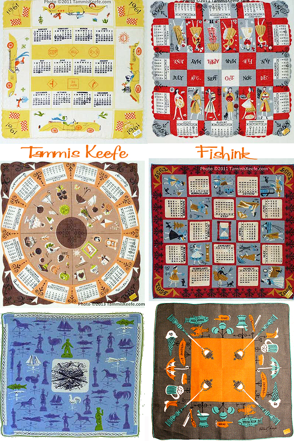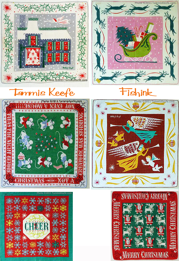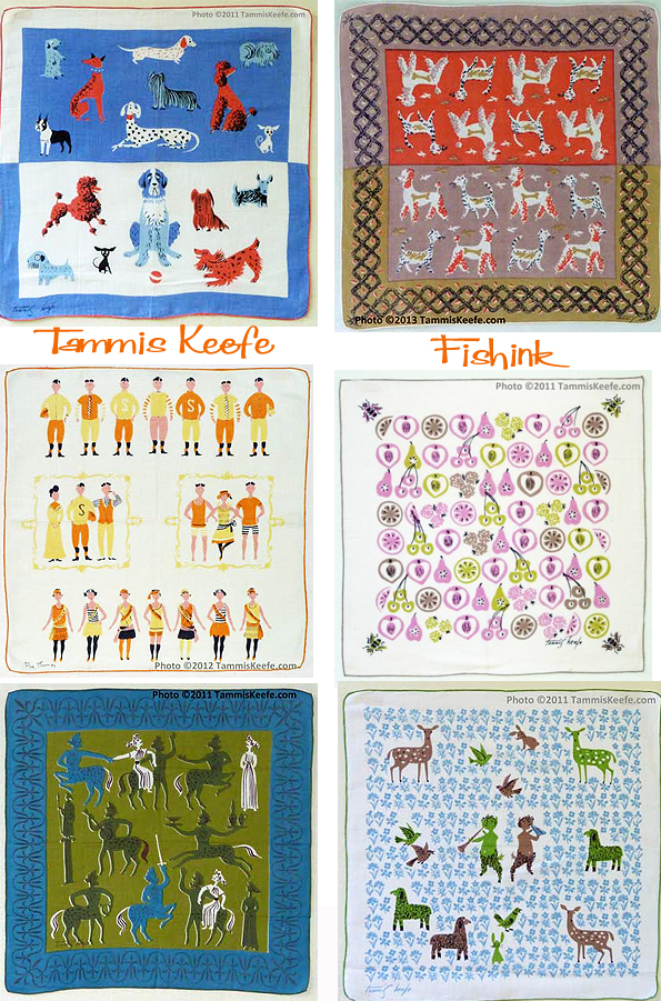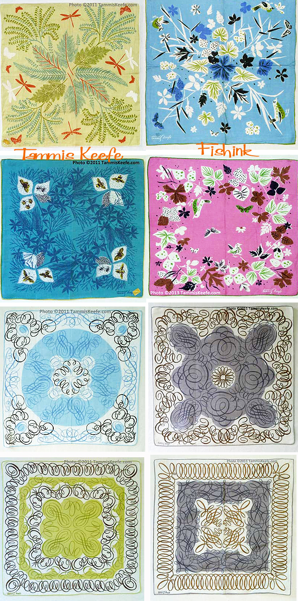Even rarer are clothing items she designed for the Marlboro Shirt Company. Also, hankies signed Peg Thomas are Tammis Keefe designs. There are hundreds of Keefe designs to choose from, as she was quite prolific, especially considering that she died in 1960 and had a relatively short career.