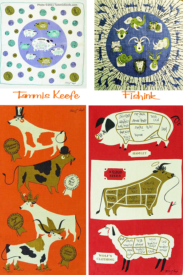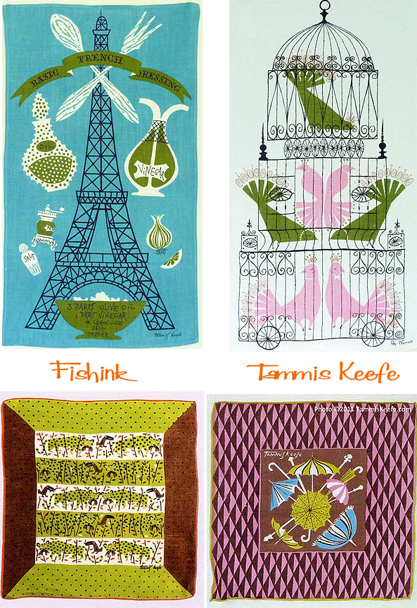 Keefe’s hankies are most prized, but look also for linens and fabrics with her signature. Her designs for the kitchen are just as clever and fresh as her hankies. Silk scarves with the Tammis Keefe signature are rarer, but do surface from time to time.
