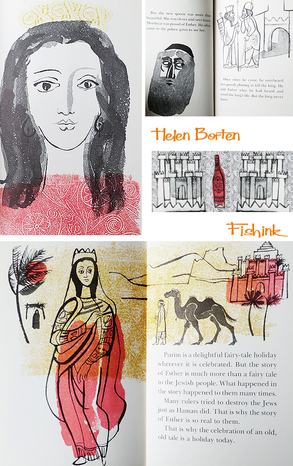 Purim is celebrated by giving reciprocal gifts of food and drink, giving charity to the poor, a celebratory meal, and public recitation of the Scroll of Esther, additions to the prayers and the grace after meals. Other customs include drinking wine, wearing of masks and costumes, and public celebration. I love the way that Helen uses collage to create these outfits below. Such a lovely array of watercolour and pen and ink techniques.