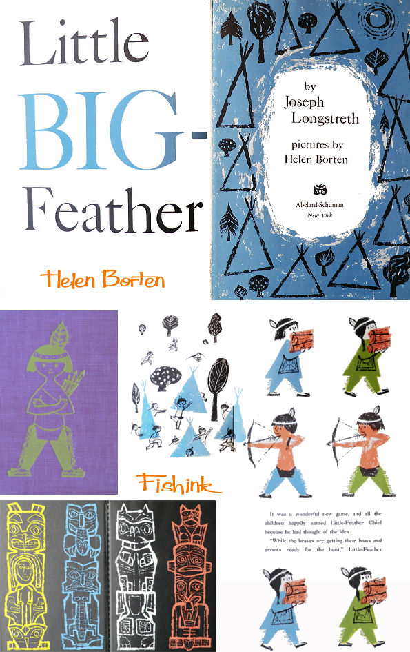 The last book I’m going to feature today was ( I believe) one of Helen’s first to Illustrate, ‘Little Big Feather’ from 1956 (more info here). Helen’s donated copy no longer has it’s cover but it would have looked like this. This book was featured in the New York Times Ten Best-Illustrated Children’s Books of 1956 and it was this fact that gave Helen’s career a great boost.