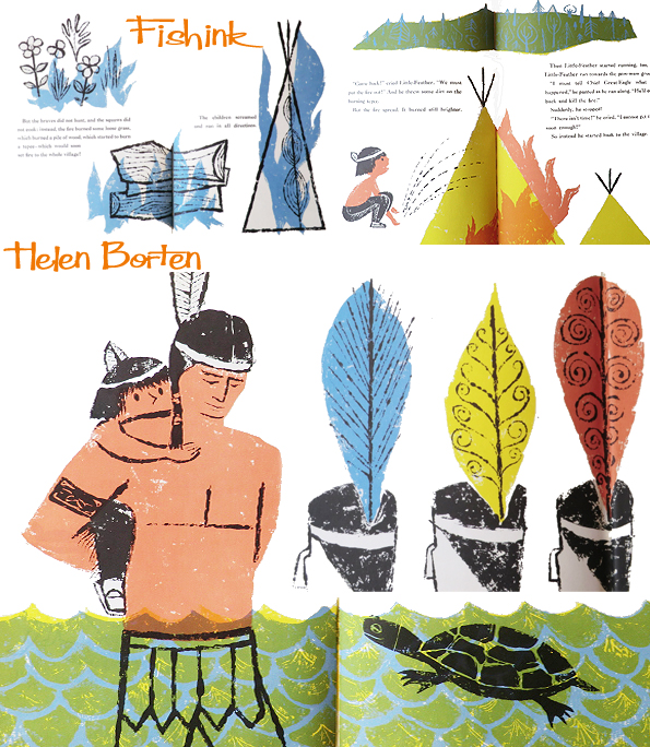 I can only imagine how much fun it must have been to assemble all the different drawings, watercolours, prints and collages to make each book the illustrative joy that it is. Look at this wonderful beak nosed Red Indian saying ” No. No, No ” ! It’s a style that modern illustrators are copying today, but Helen was one of the first artists to create and introduce it.
