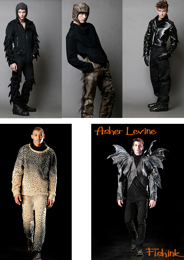 ” I began making clothes when I was 10 years old, designing was the only future I could think of. I moved to New York in 2006 to get a business degree, and while in school I made clothes in my basement in the West Village. After graduating, I launched my first collection. ” Asher explores ideas about accentuating the male form through his clothing. There’s a mystic often dark side to what appears. His 2012 Collection looking more like a cross between Marvel Comic Heros and Dr Who Monsters rampage the high street lol.