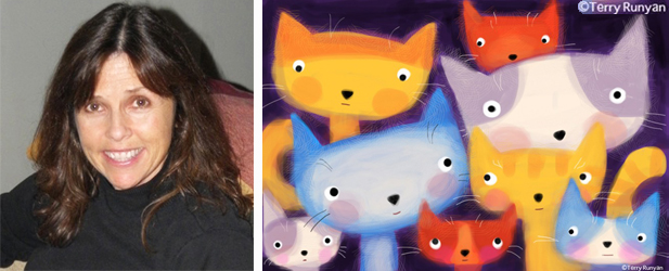 Terry Runyan is an American artist who works full-time for Hallmark Cards in Kansas City. She also does artwork for fun featuring quirky cats, dogs and animals of all kinds. I messaged Terry to find out a little more about her creative illustrations. Graduating from San Jose State University with a degree in Design and Illustration, Terry was snapped up by Hallmark recruiters within 6 months of finishing her degree and has worked there ever since.