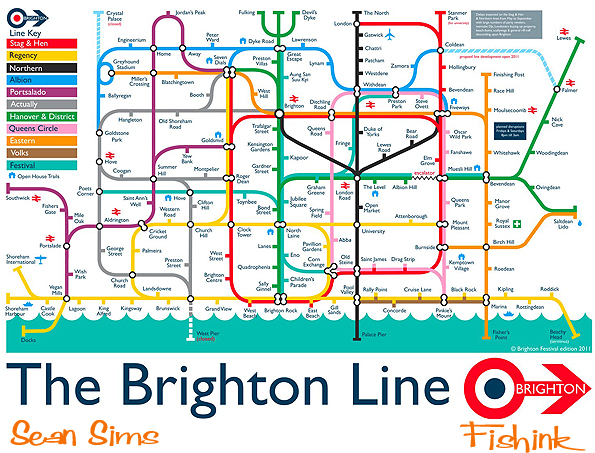 One of Sean Sims’ most successful creations has been ‘The Brighton Line’, a quirky version of the London underground map based on his beloved home city. It is a delightful journey of the city’s real locations, from Devil’s Dyke in the north to Brighton Rock in the south. The Hove line is wittily called ‘Actually’, in reference to the residents’ determination to maintain their independence from Brighton. When it was realised Sims said, “I think it’s the first time someone has designed a Tube map of Brighton and I hope it puts the city on the map.”