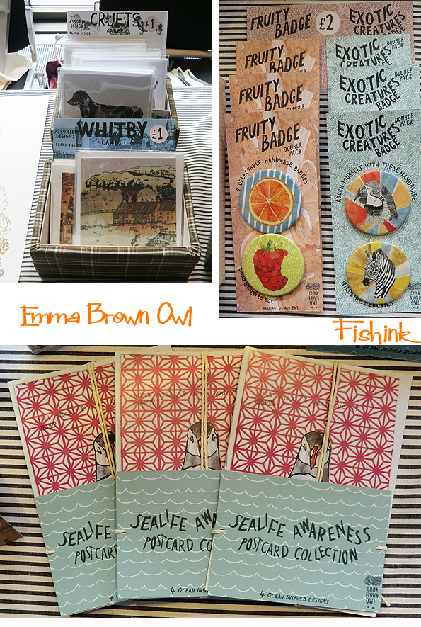Emma Brown Owl who graduated from Manchester School of Art in 2010, had put together a charming collection of contemporary seaside ephemera. Birds, badges and Whitby featured in illustrative abundance. The stand looked great and the stripy cloth somehow gave it even more of a beach / coastal feel.