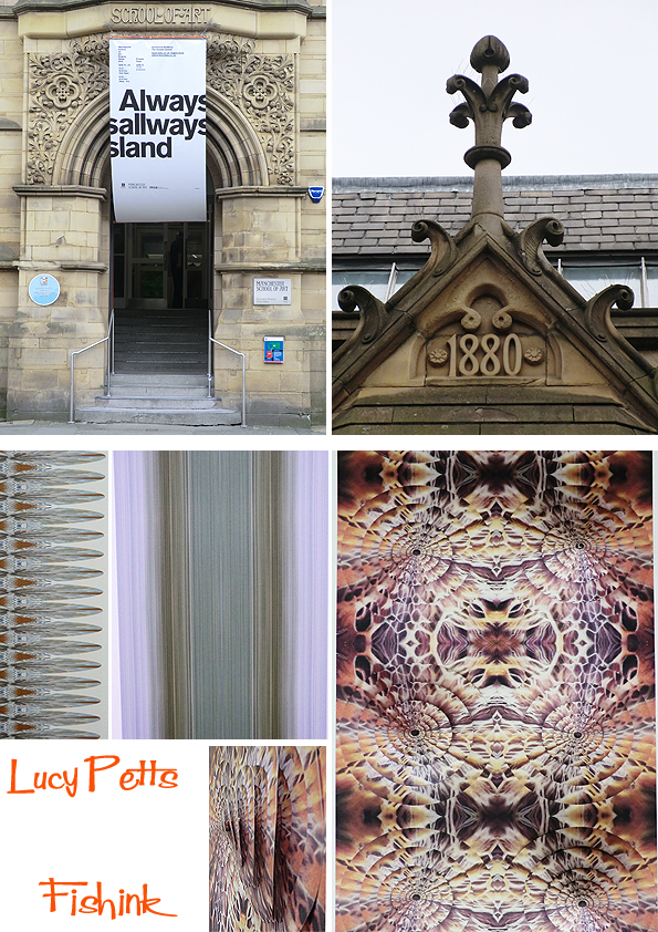 Yesterday I went into town to see the degree shows at Manchester School of Art. There’s a rather grand entrance to the Grosvenor Building on Cavendish Street just off Oxford Road. You can only really appreciate it’s beauty by crossing the road and looking up. I’d like to start with some 2D and 3D wallpaper designs from Lucy Petts. I’d love to see how much impact a whole room of the green and white stripe would have…. Wowsa ! Fishinkblog 7722 MMU show 2014 1
