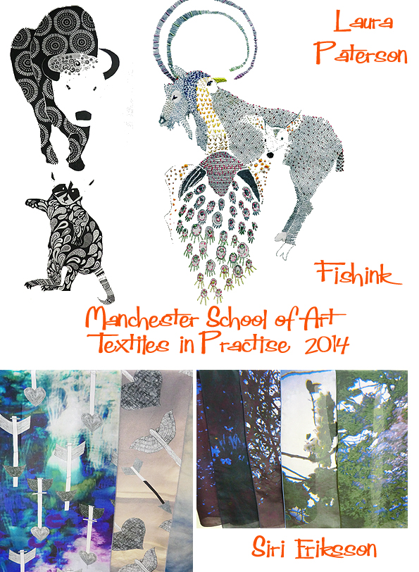 Moving onto the Textiles section and some great animal textures from Laura Paterson and silk scarves with photographs and hand drawn birds and arrows by Siri Eriksson.