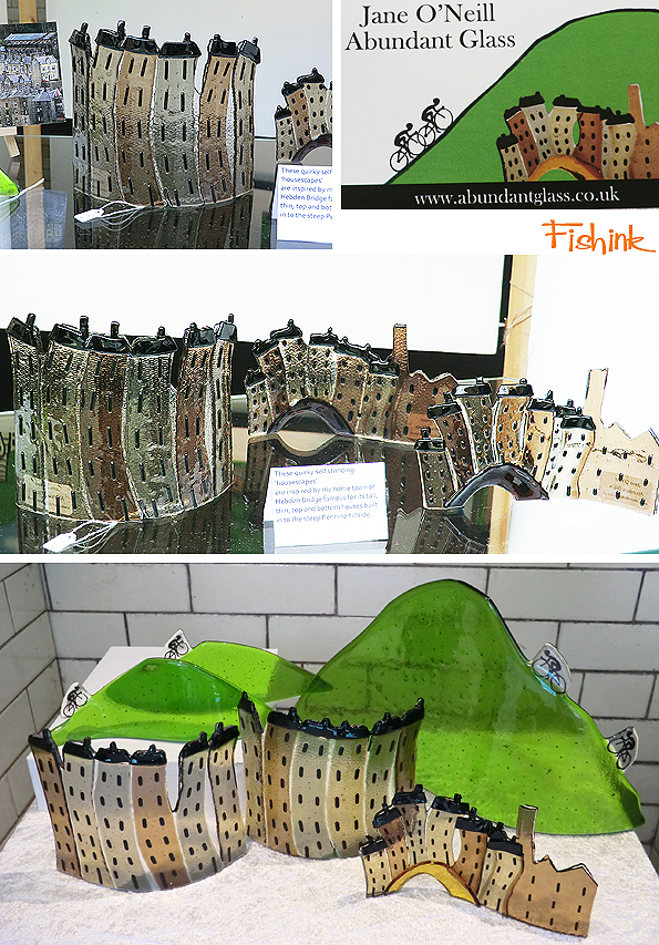 One glass artist from the Pennines Jane O Neill, makes more humorous sculptures depicting the long thin houses of Hebden Bridge and the Yorkshire contribution to the Tour De France from earlier this year.