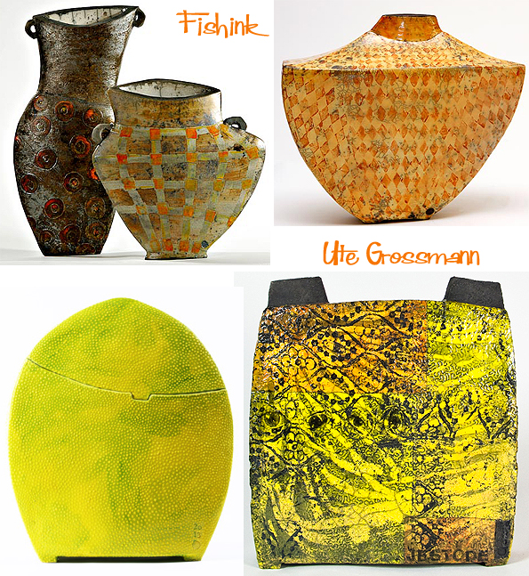 Ute Grossmann was born in Dresden, Germany in 1960. Having originally studied Chemical Engineering, she gravitated towards the arts with studies in painting and graphics at the  Academy of Fine Arts, Dresden in 1998/1999. On discovering her ceramics, I was not only amazed at the vast body of her work but also the variety of textures, colours and surfaces that she creates. A real textile designers dream in ceramic form : )
