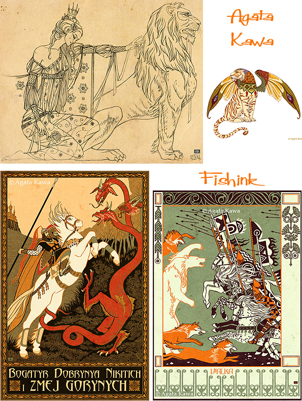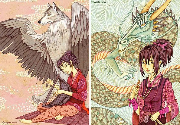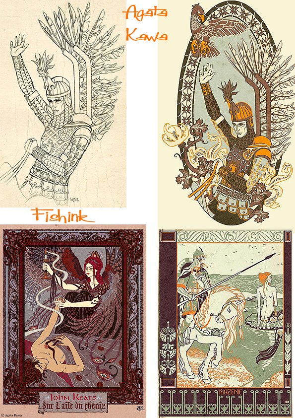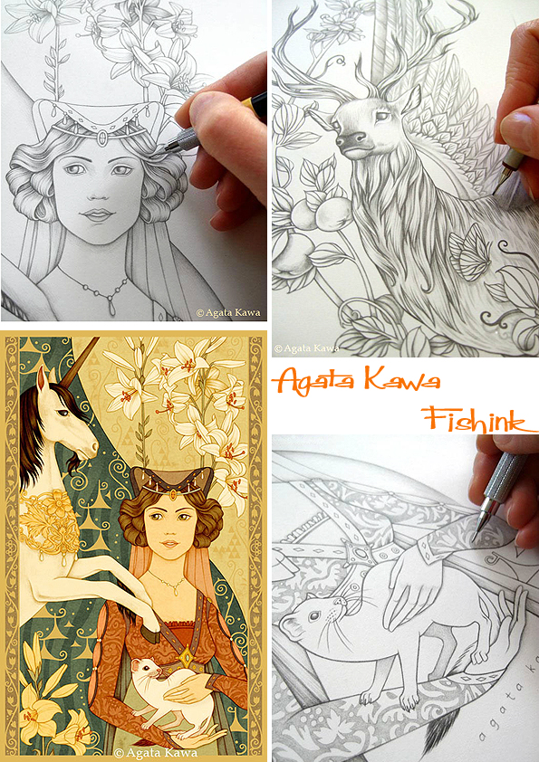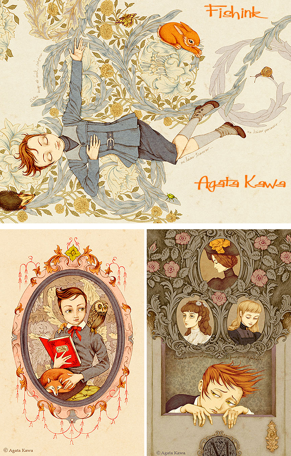 Agata Kawa is a painter and contemporary artist. She is something of an enigma and occasionally completely changes her illustration style from the one I’ve concentrated on in this post. Her art and work in Décorative Arts places itself in the continuation of the 19th century Symbolists and Arts & Crafts movements. She even takes elements from their paintings. Below you can see Agata’s drawing , influenced by John Everett Millais.