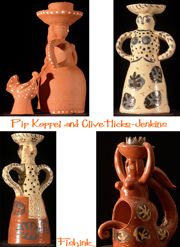 Clive told me ” I have worked with ceramics. I spent time with the ceramist Pip Koppel, who’s a close friend. She threw and I decorated. It was just a bit of fun, and we made mostly stuff for the kitchen of the house my partner and I were about to move into. Lots of slip-trailed ware. I made a ‘foliate-head’ dinner-service, and lots of decorated bowls and jugs. Simple little figurines of animals too. All quite primitive and lively.