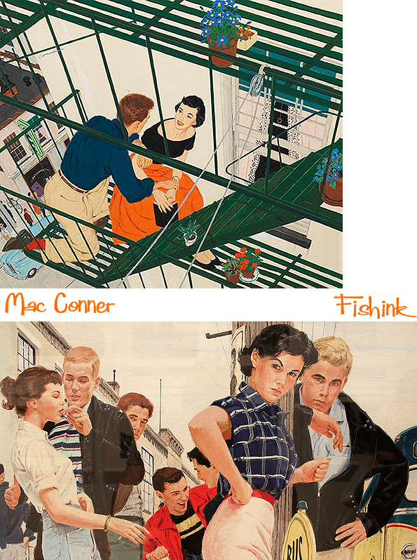 Mac paid close attention to the fashion of the day, including the wasp-waisted full skirts that celebrated the end of fabric rationing after WW2. The ubiquitous garments emphasised the figure when worn with restrictive corsetry. Conner credits Jessie Neeley, his agent’s wife, with adding “polish” to his depictions of women by helping him to stay aware of trends in necklines, hairstyles and glove lengths. He also consulted the collections of emhemera and photographs at the NY Public Library, as did many of his peers.