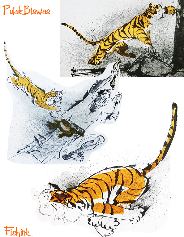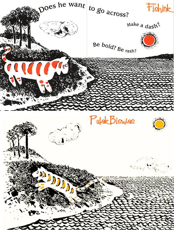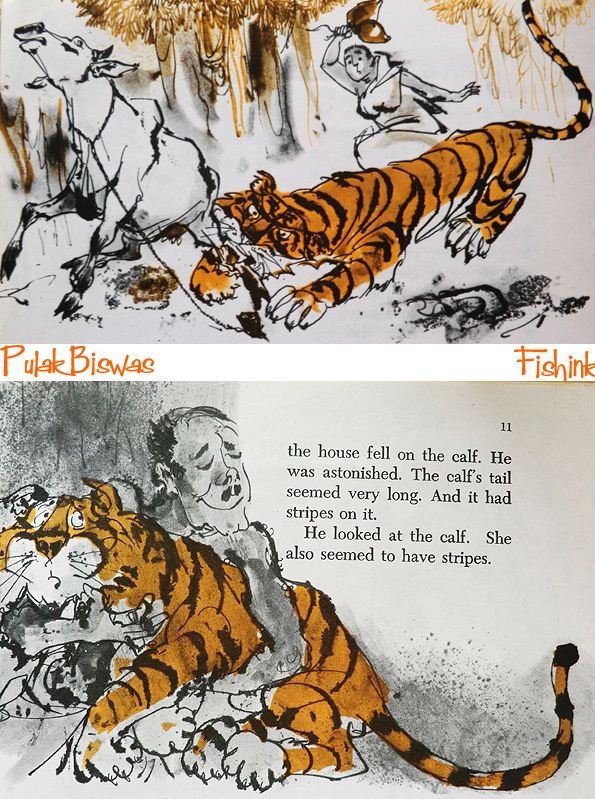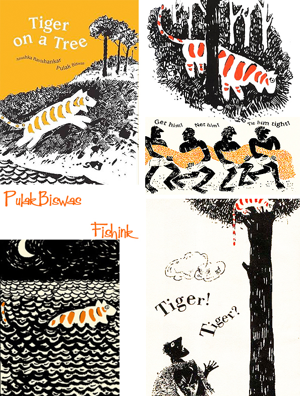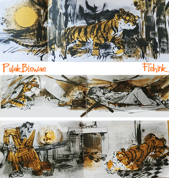 I was in Chennai to attend a workshop where I met a lady working in a tiger project in Sundarban in Bengal. She told me about a certain incident. I thought it would make a very interesting story. So I did the story in verse and did the illustrations in black and white to cut down cost. I gave it to Tara Book. They liked the story and decided to publish it as Tiger on a Tree in two colours and with the text in rhyme. It was written in rhyme by Anuskha Ravishankar.