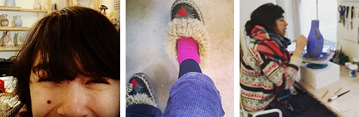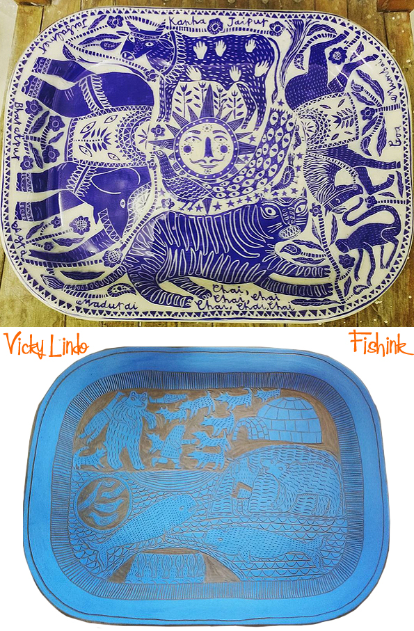 The ideas often originate in a sketch or painting. It helps to determine where shapes and pattern will be, sometimes this will be altered slightly for the final piece. The hardened clay object to be decorated is then coated with a layer of different coloured slip (watered down clay) and once that’s dried, the design can be drawn and cut into (sometimes called Sgraffito). You have to be clever at thinking in monotone and good with shapes and pattern, it’s not as easy as you may think.
