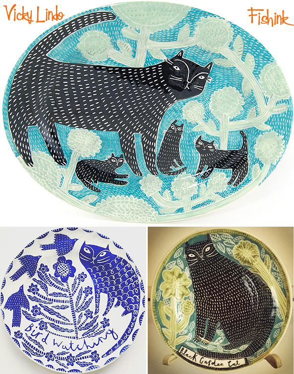 Sometimes Vicky hand decorates directly onto a pre-fired piece. Having cats around the home and studio must help when using your imagination to conjure up these whimsical pieces. Of course the cats help out too… when then can!