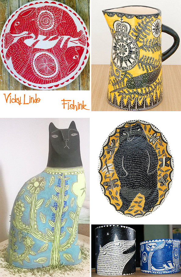 Vicky Lindo has been on my ‘posts to relist’ for quite sometime now.  Based down in Bideford in Devon, she used to work for a number of years in the Burton Art Gallery. Until, both influenced and fascinated by an exhibition of the R J Lloyd slip-ware collection, made in the middle ages by farmers and country folk, (more here), she decided to start up her own workshop and make her personal range of slip-ware. Below are a sample of the ceramics Vicky was inspired by… and I can see why !