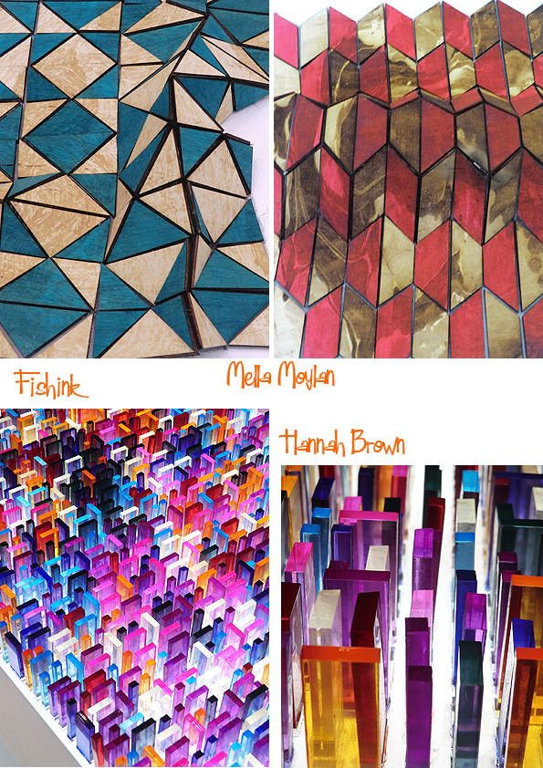 Hannah Brown says her work ” has a strong relationship to light and I incorporate the use of transparent or reflective materials in conjunction with other tactile surfaces. I enjoy manipulating materials through a variety of different processes, such as embossing, laser cutting, printing, dying and hand craft techniques ” Very effective they are too.
