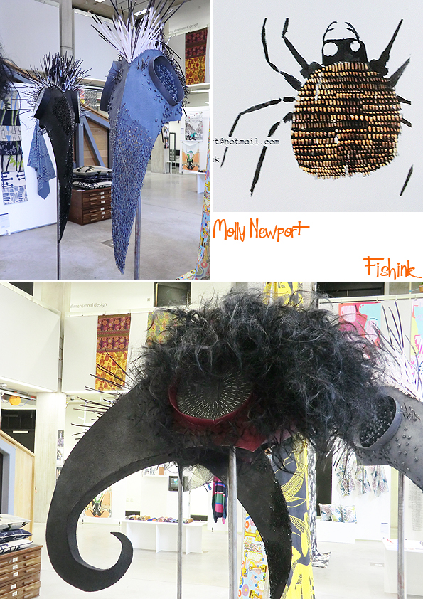 Molly Newport  says ” Using the language of embroidery and particularly embellishment, I have developed a practice that is primarily aimed at an illustrative context. I am an avid drawer, and use my textile skills to realise the translation of two dimensional mark on paper into both three-dimensional and two-dimensional works that give the drawn mark and form a physical and tactile quality” I can see these working well in a theatre or children’s drama.
