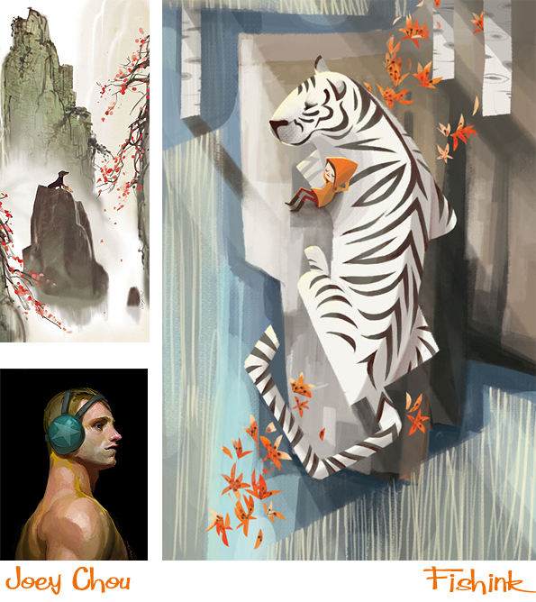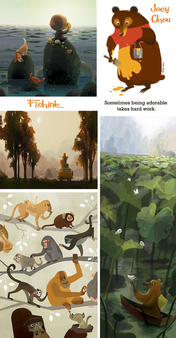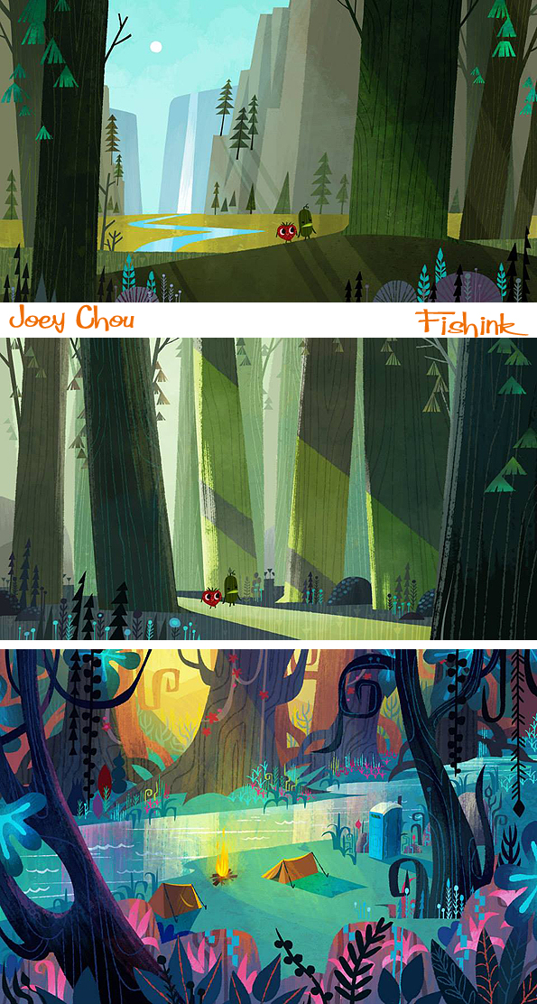 Joey Chou is an alumni and graduate of the Art Centre College of Design in Pasadena, CA. Joey was born in Taiwan and moved with his parents and sister to the U.S. when he was 15. He is strongly influenced by the work of Disney artist Mary Blair, comic books and 1950’s and 60’s geometry, as am I ! He has a wonderful vision for creating scenes and settings.